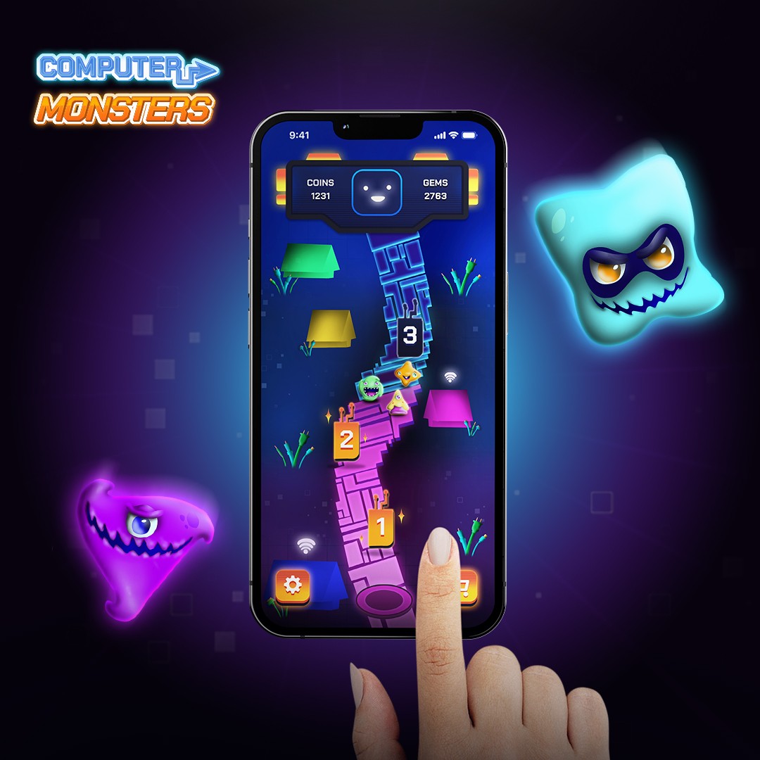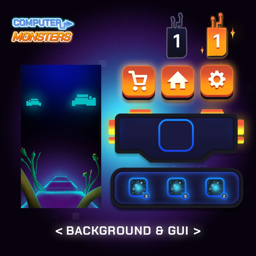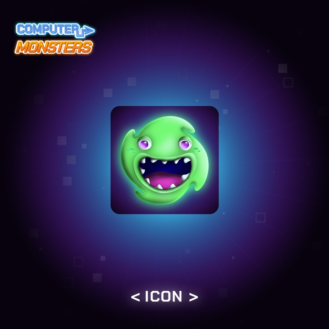 In Computer Monsters, the player is tasked with cleaning their computer from dangerous viruses threatening to destroy all files. Each level represents a different infected zone that must be "purified" by defeating unique virus characters. The game combines glowing, tech-inspired visuals with simple geometric shapes. Each virus character represents a different threat type, such as malware, trojans, and data thieves, each with a distinct visual and behavioral identity. Players use computer-themed abilities and tools to fight off the viruses, turning a dark digital threat into a colorful, fun experience suitable for both kids and adults. The core design challenge was to balance the seriousness of the theme with playful, approachable aesthetics while keeping a clear connection to both the digital and gaming worlds.